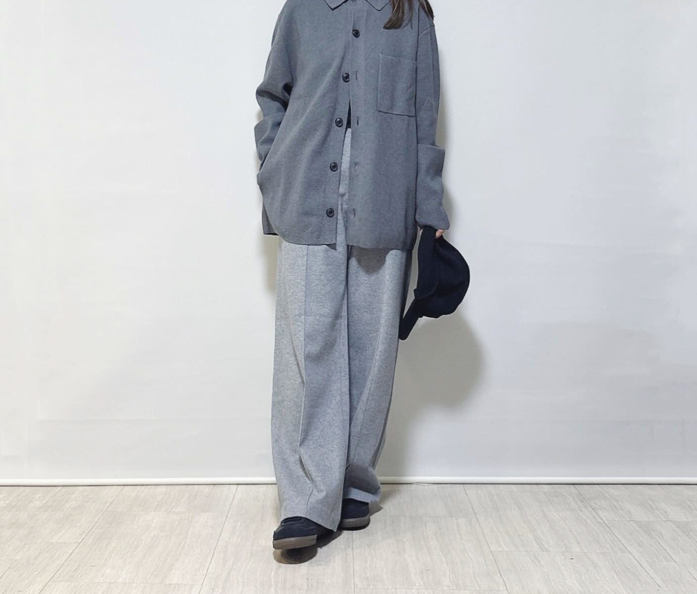 着心地のよさと洗練されたデザインを兼ね備えたユニクロの定番アイテムを、程よい抜け感とこなれ感を意識したスタイリングで見せてくれます。グレーは、トレンド感を取り入れつつも品よく仕上がる万能カラー。オフィスにもカジュアルにも活躍するため、忙しい40代女性にとって心強い味方です。