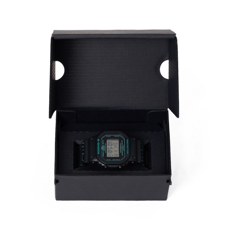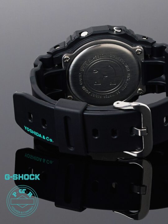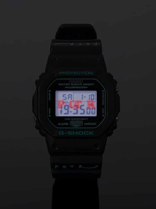 今回のコラボでは、初代“DW-5000”のDNAを引き継いだ“DW-5600”の基本モデル“DW-5600UE-1JF”をベースにし、オクタゴン(八角形)のベゼルに、スクエア型ディスプレイのデザインが特徴。本体の随所に、「POTR」を象徴するカラーの一つであるターコイズブルーを採用し、バックライト点灯時に浮かび上がる「POTR」ロゴ、裏蓋に「POTR」スマイリーの刻印を施した。