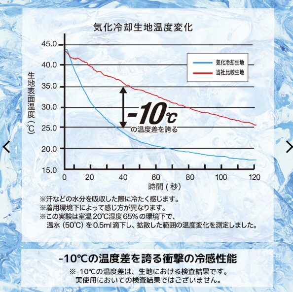 「-10℃」は、汗や水分と反応した際に、生地表面の温度が下がる気化冷却の効果を数値で示したもの。あくまで試験環境下での最大値ではあるものの、科学的な裏付けがあるのは安心だ。