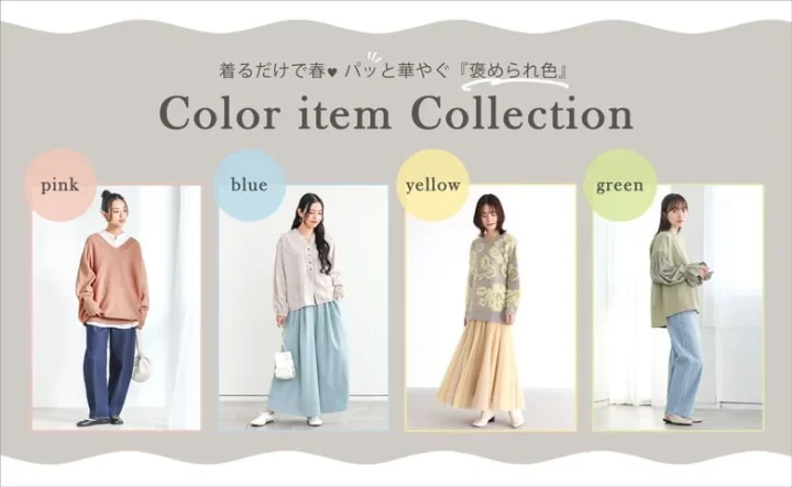 ホワイトやグレーに合わせるだけで、周囲を明るくするレモンイエローやたまご色も展開されています。派手に見えがちですが、日本人の肌に馴染みやすく、コーディネートのアクセントになるでしょう。カーディガンやカットソーなど、顔周りで「季節の先取り」を感じさせる、元気が出るカラーがピックアップされています。