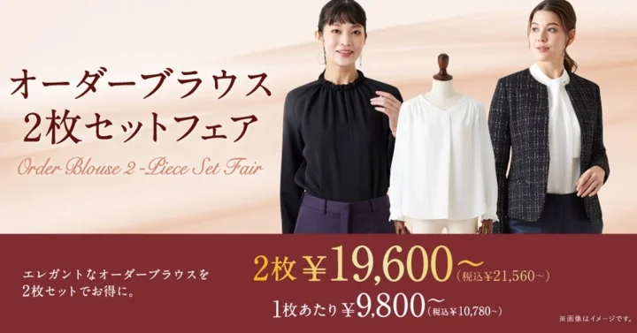 本フェアでは、オーダーブラウスを2枚セットで19,600円(税込21,560円)から購入できます。これは1枚あたり9,800円(税込10,780円)となり、通常価格の1枚11,900円(税込13,090円)から比較すると、より手頃な価格でオーダーブラウスを手に入れることができます。レディース対応の全店舗で注文が可能です。