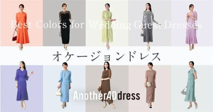 結婚式のゲストドレスに最適な色を紹介する画像で、様々な色のオケージョンドレスを着用した女性モデルが10人並んでいます。