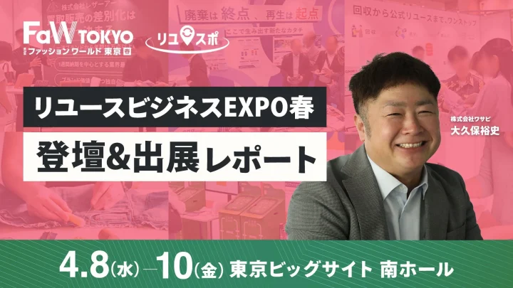 イベント期間中、アパレル事業をはじめ、買取販売・メーカーなど多くの事業者がブースを訪れました。4月9日(木)には、同社代表の大久保裕史氏が「拡大する世界のリユース市場 ― アパレル業界の新しい可能性」と題したセミナーに登壇し、国内外の市場比較と大手ブランドが取り組む「Re commerce(リコマース)」の最新動向を解説しました。
