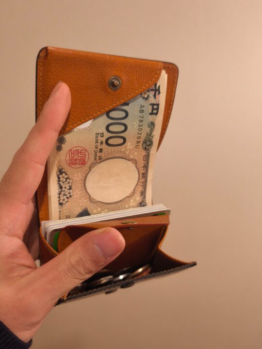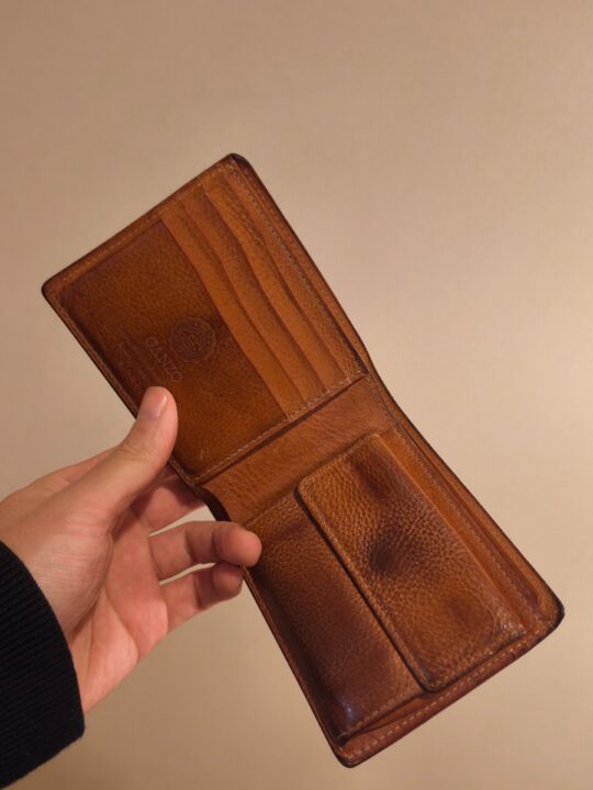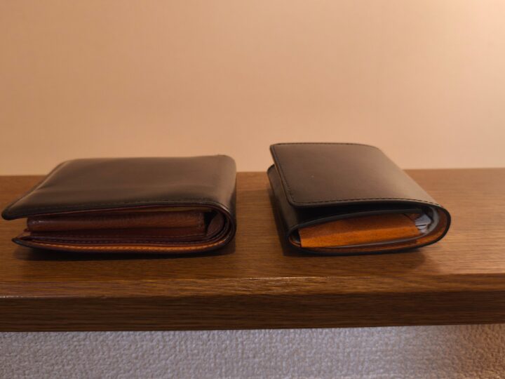 1枚目の右の二つ折りはガンゾのブライドルレザーでちょっと高いやつ新しく買ったのはAmazonで8000円のFabrizioっていうメーカーのコンパクト財布だよ