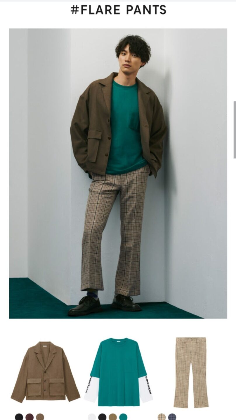 まんまこの組み合わせで着るとパンツにチェック入ってるからインナーの色はもっと落ち着いてないと難しいな