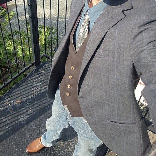 シャツの首回りがガバガバだし、ボタン全留めのベストの裾からネクタイの剣先が出てるしでコーデ以前の問題
