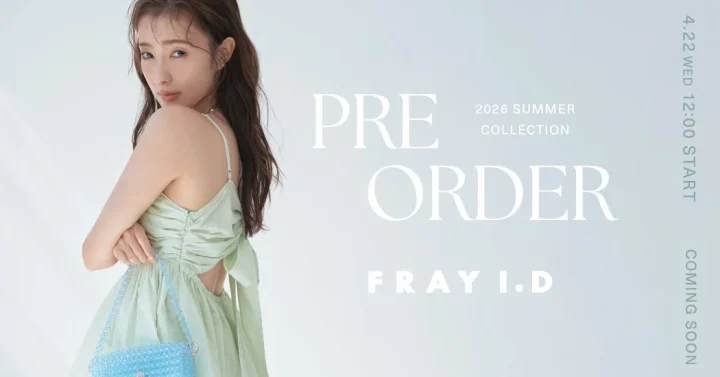 FRAY I.D 2026年夏の最新コレクションのWEB先行予約は、2026年4月22日(水)12:00(正午)より開始されます。各アイテムの予定納期に基づき順次販売されます。