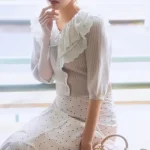 薄いオレンジ色のブラウスと白いレーススカートを身につけた、軽やかで上品な夏の装いです。