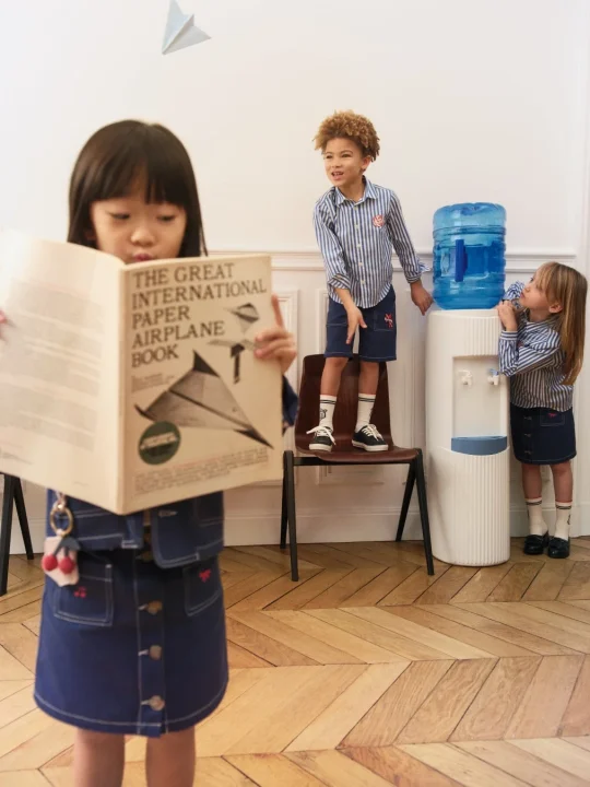 ガールズ&ボーイズコレクション(4~14歳):ストライプシャツ、シャツドレス、ワークウェアジャケット、刺繍Tシャツ、ギャバジンショーツ、スカートなどが展開されます。プレッピースタイルを現代的に解釈し、東京とパリのエッセンスを感じさせる遊び心あるデザインに仕上げられています。