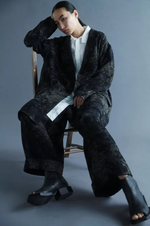 絨毯柄をジャカード織で表現したアシンメトリージャケットとフロントタックパンツが登場しています。柔らかくしなやかな風合いの中に、織りが生み出す奥行きと立体感を宿しています。伊勢丹新宿店限定カラーはブラックで、通常カラーはブルーで展開されています。
