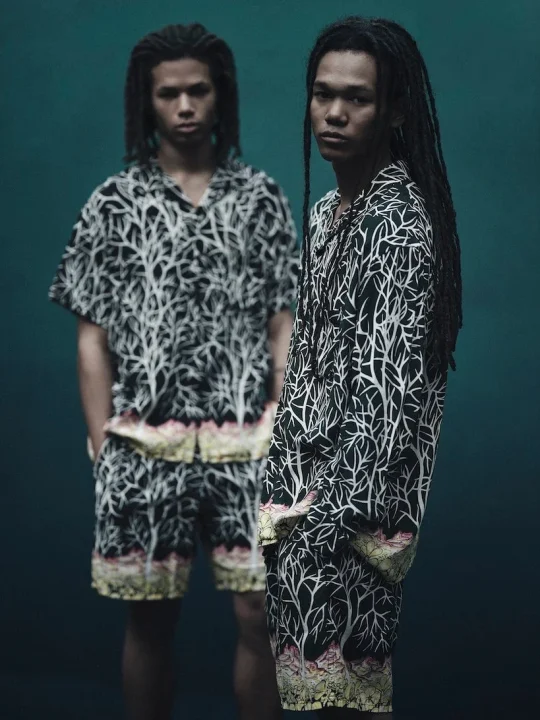 ヴィンテージのニュアンスを感じさせる落ち感のあるレーヨン素材には、火山や枯れ木を想起させるテキスタイルがプリントされたハワイアンシャツとショーツが登場します。