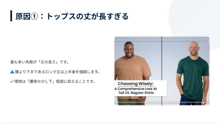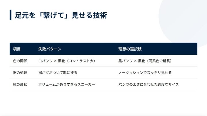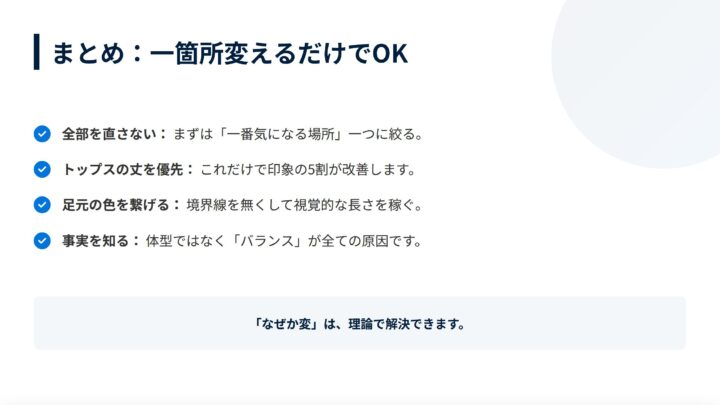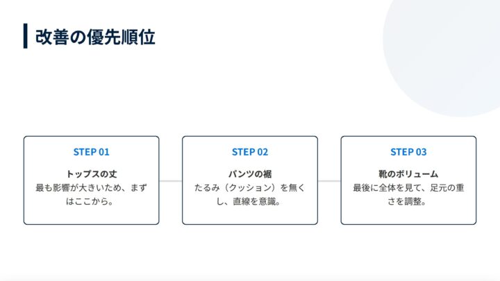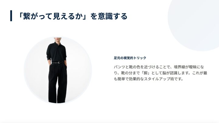 ・パンツに少し特徴があるなら、トップスは短め・無地