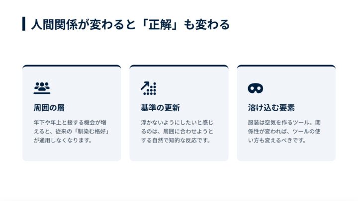 仕事や生活が変わると、服の役割も変わる