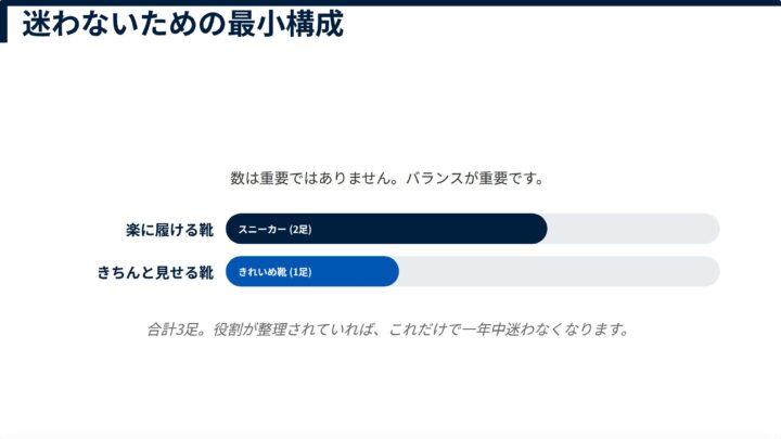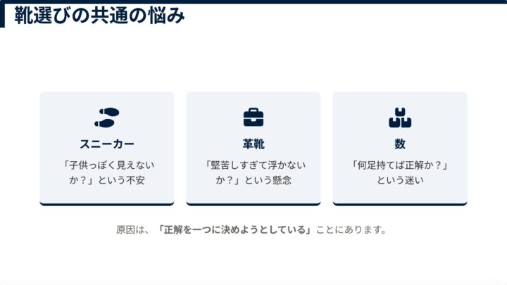 スニーカー・革靴・靴の数といった悩みを整理し、