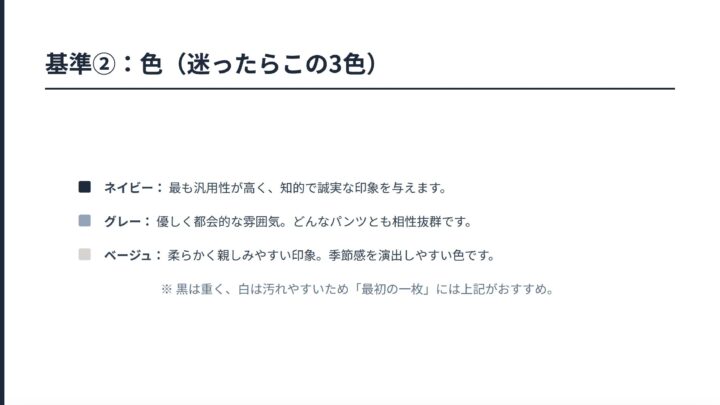 - ネイビー・グレー・ベージュなどの定番色
